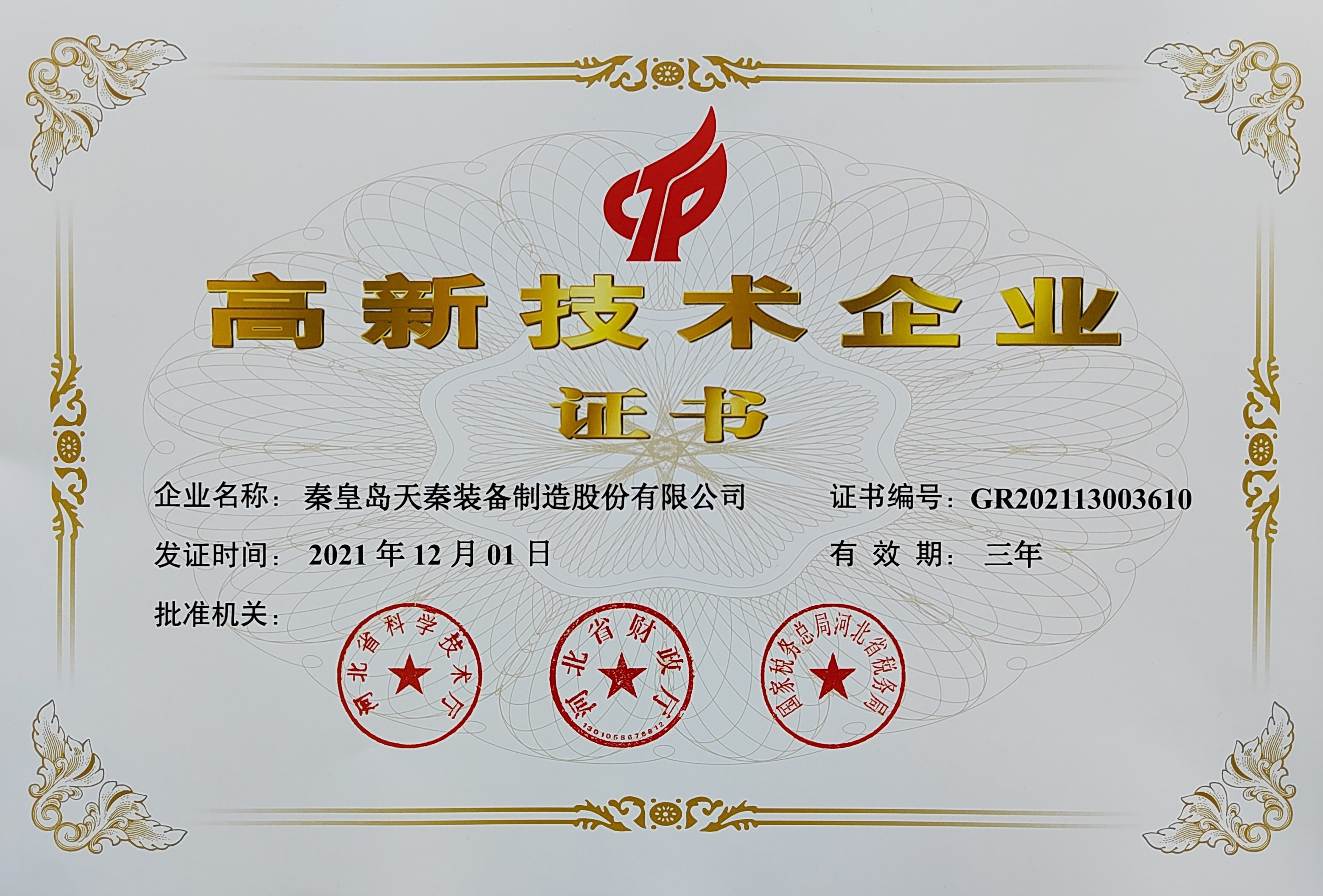 • 秦皇島天秦裝備制造股份有限公司創(chuàng)立于1996年,總部位于河北省秦皇島市經(jīng)濟(jì)技術(shù)開(kāi)發(fā)區(qū),秦皇島廠(chǎng)區(qū)占地4萬(wàn)平方米,擁有3萬(wàn)平方米的標(biāo)準(zhǔn)廠(chǎng)房、辦公樓和工程技術(shù)研發(fā)中心;分部天津廠(chǎng)區(qū)位于天津市靜海經(jīng)濟(jì)開(kāi)發(fā)區(qū),占地2萬(wàn)平方米,擁有1.6萬(wàn)平方米標(biāo)準(zhǔn)廠(chǎng)房。 公司通過(guò)了GB/T 19001質(zhì)量管理體系及GB/T 24001環(huán)境管理體系認(rèn)證,是國(guó)家高新技術(shù)企業(yè)、河北省軍民融合產(chǎn)學(xué)研用創(chuàng)建基地,建有省級(jí)院士工作站。